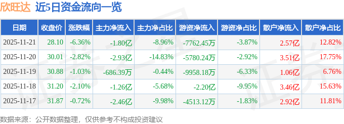 证券之星消息,截至2025年11月21日收盘,欣旺达(300207)报收于28.1元,下跌6.36%,换手率4.09%,成交量70.08万手,成交额20.06亿元。