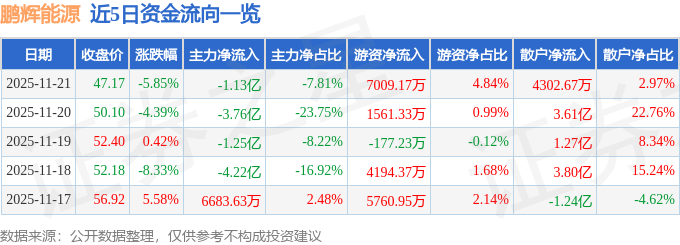 证券之星消息,截至2025年11月21日收盘,鹏辉能源(300438)报收于47.17元,下跌5.85%,换手率7.48%,成交量30.22万手,成交额14.48亿元。