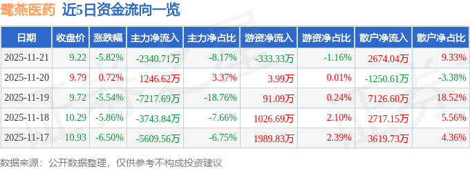 证券之星消息,截至2025年11月21日收盘,鹭燕医药(002788)报收于9.22元,下跌5.82%,换手率7.9%,成交量30.18万手,成交额2.87亿元。