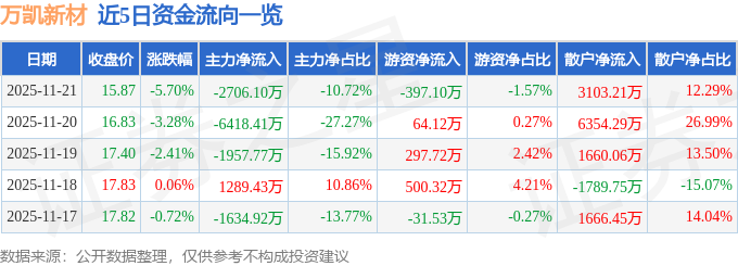 证券之星消息,截至2025年11月21日收盘,万凯新材(301216)报收于15.87元,下跌5.7%,换手率2.87%,成交量15.69万手,成交额2.53亿元。