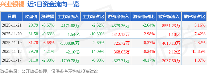 证券之星消息,截至2025年11月21日收盘,兴业银锡(000426)报收于29.79元,下跌5.67%,换手率3.09%,成交量54.84万手,成交额16.59亿元。