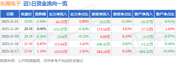 证券之星消息,截至2025年11月21日收盘,东南电子(301359)报收于19.05元,下跌5.6%,换手率3.91%,成交量2.67万手,成交额5212.64万元。