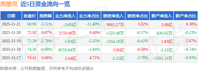 证券之星消息,截至2025年11月21日收盘,英维克(002837)报收于68.9元,下跌5.51%,换手率5.44%,成交量46.21万手,成交额32.04亿元。