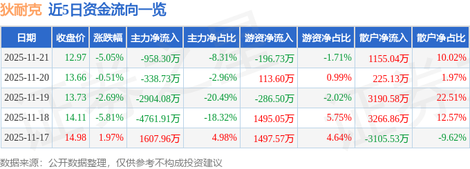 11月21日的资金流向数据方面,主力资金净流出958.3万元,占总成交额8.31%,游资资金净流出196.73万元,占总成交额1.71%,散户资金净流入1155.04万元,占总成交额10.02%。