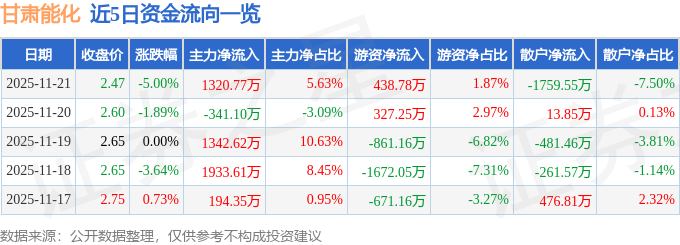 证券之星消息,截至2025年11月21日收盘,甘肃能化(000552)报收于2.47元,下跌5.0%,换手率2.5%,成交量93.12万手,成交额2.35亿元。