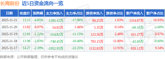 证券之星消息,截至2025年11月21日收盘,长海股份(300196)报收于13.15元,下跌4.85%,换手率2.36%,成交量5.81万手,成交额7766.73万元。