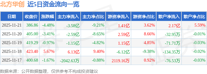 证券之星消息,截至2025年11月21日收盘,北方华创(002371)报收于386.86元,下跌4.48%,换手率1.37%,成交量9.88万手,成交额38.82亿元。