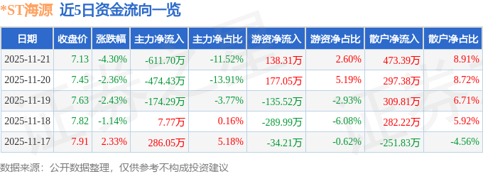证券之星消息,截至2025年11月21日收盘,*ST海源(002529)报收于7.13元,下跌4.3%,换手率2.83%,成交量7.36万手,成交额5311.7万元。