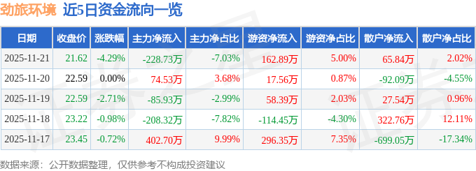证券之星消息,截至2025年11月21日收盘,劲旅环境(001230)报收于21.62元,下跌4.29%,换手率2.79%,成交量1.48万手,成交额3254.81万元。