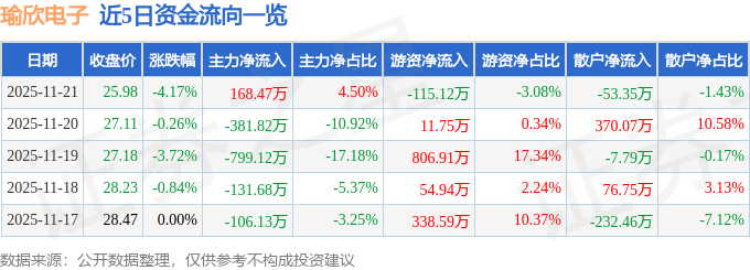 证券之星消息,截至2025年11月21日收盘,瑜欣电子(301107)报收于25.98元,下跌4.17%,换手率2.38%,成交量1.42万手,成交额3741.39万元。