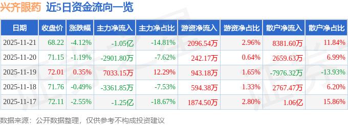 证券之星消息,截至2025年11月21日收盘,兴齐眼药(300573)报收于68.22元,下跌4.12%,换手率5.4%,成交量10.24万手,成交额7.08亿元。
