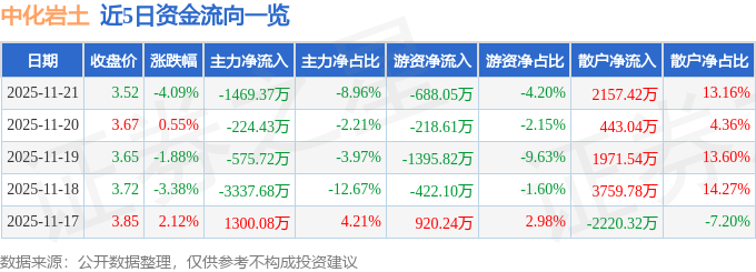 证券之星消息,截至2025年11月21日收盘,中化岩土(002542)报收于3.52元,下跌4.09%,换手率2.62%,成交量46.03万手,成交额1.64亿元。