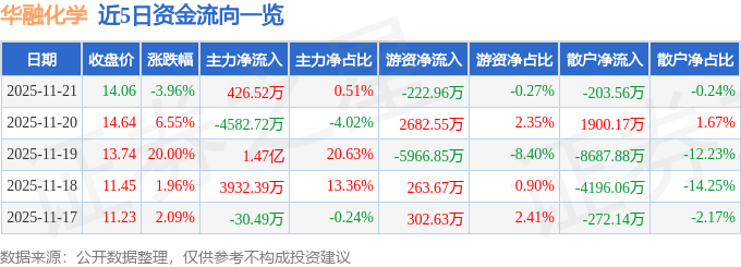证券之星消息,截至2025年11月21日收盘,华融化学(301256)报收于14.06元,下跌3.96%,换手率12.78%,成交量61.33万手,成交额8.39亿元。