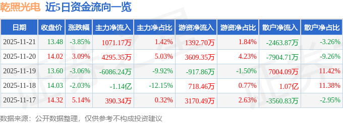 证券之星消息,截至2025年11月21日收盘,乾照光电(300102)报收于13.48元,下跌3.85%,换手率5.99%,成交量54.93万手,成交额7.56亿元。