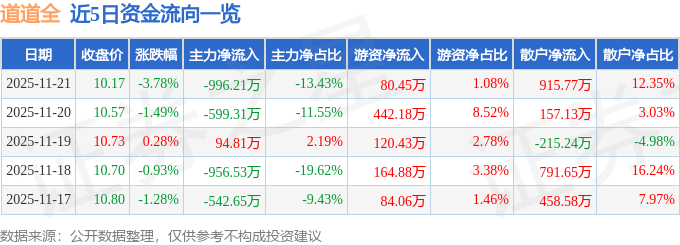 证券之星消息,截至2025年11月21日收盘,道道全(002852)报收于10.17元,下跌3.78%,换手率2.52%,成交量7.18万手,成交额7416.82万元。