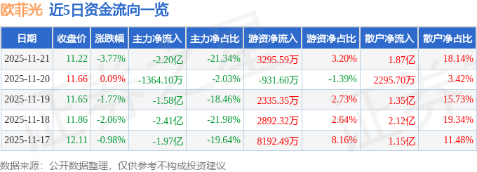 证券之星消息,截至2025年11月21日收盘,欧菲光(002456)报收于11.22元,下跌3.77%,换手率2.73%,成交量90.59万手,成交额10.29亿元。