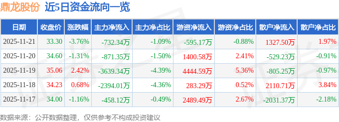 证券之星消息,截至2025年11月21日收盘,鼎龙股份(300054)报收于33.3元,下跌3.76%,换手率2.69%,成交量19.79万手,成交额6.75亿元。