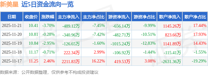 11月21日的资金流向数据方面,主力资金净流出489.12万元,占总成交额7.45%,游资资金净流出656.14万元,占总成交额9.99%,散户资金净流入1145.26万元,占总成交额17.44%。