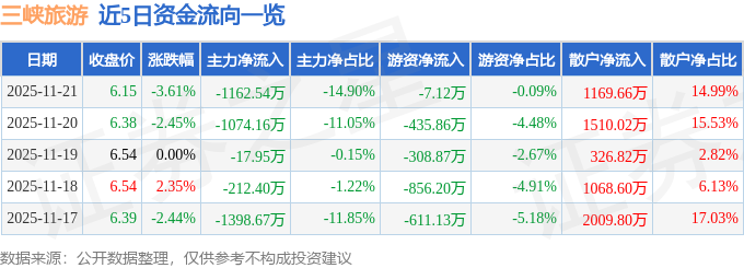 证券之星消息,截至2025年11月21日收盘,三峡旅游(002627)报收于6.15元,下跌3.61%,换手率1.74%,成交量12.51万手,成交额7803.63万元。