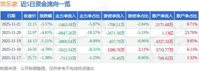 证券之星消息,截至2025年11月21日收盘,欢乐家(300997)报收于22.15元,下跌3.57%,换手率2.88%,成交量11.1万手,成交额2.49亿元。