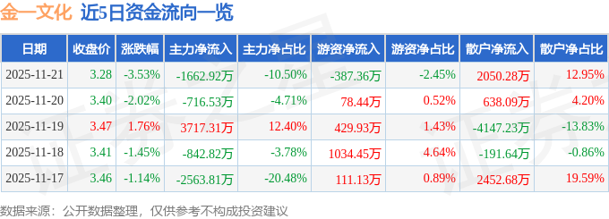 证券之星消息,截至2025年11月21日收盘,金一文化(002721)报收于3.28元,下跌3.53%,换手率1.79%,成交量47.55万手,成交额1.58亿元。