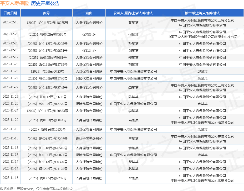 证券之星消息,根据天眼查APP显示,近日公布了一则中国平安人寿保险股份有限公司作为被告/被上诉人的开庭公告,详细内容如下: