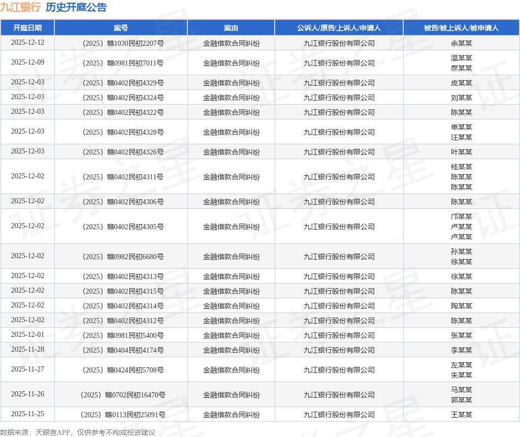 证券之星消息,根据天眼查APP显示,近日公布了一则九江银行股份有限公司作为被告/被上诉人的开庭公告,详细内容如下: