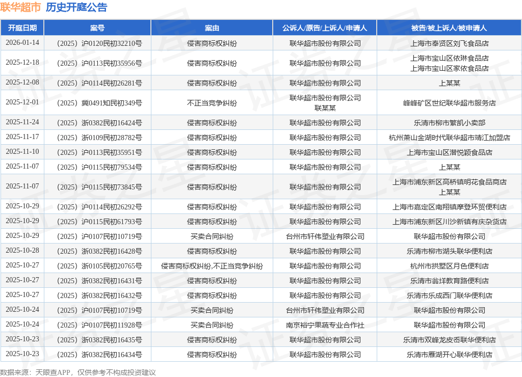 案号:(2025)浙0382民初16424号根据统计,近一年内以联华超市股份有限公司为当事人的历史开庭公告有119则,其中案由为“侵害商标权纠纷”的公告以62则居首,其次为“买卖合同纠纷”有11则,“商标权权属、侵权纠纷”有10则。历史开庭公告(前20条)如下: