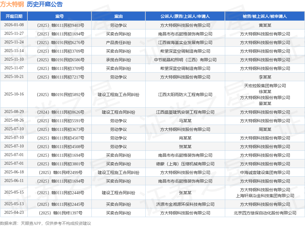 案号:(2025)赣0191民初6276号根据统计,近一年内以方大特钢科技股份有限公司为当事人的历史开庭公告有29则,其中案由为“买卖合同纠纷”的公告以12则居首,其次为“劳动争议”有6则,“建设工程合同纠纷”有3则。历史开庭公告(前20条)如下: