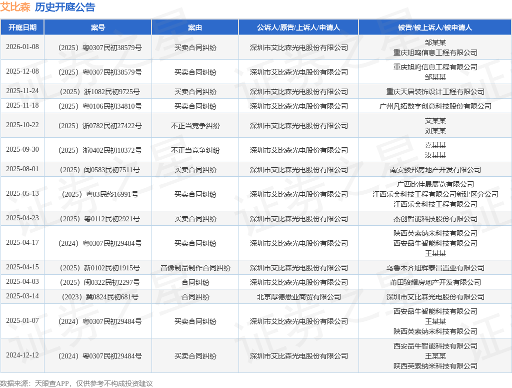 案号:(2025)浙1082民初9725号根据统计,近一年内以深圳市艾比森光电股份有限公司为当事人的历史开庭公告有15则,其中案由为“买卖合同纠纷”的公告以10则居首,其次为“不正当竞争纠纷”有2则,“合同纠纷”有2则。历史开庭公告如下: