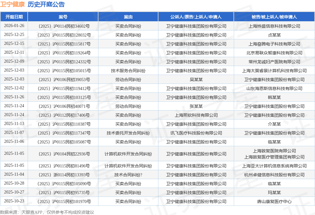 案号:(2025)沪0112民初17406号根据统计,近一年内以卫宁健康科技集团股份有限公司为当事人的历史开庭公告有77则,其中案由为“买卖合同纠纷”的公告以42则居首,其次为“劳动合同纠纷”有13则,“技术服务合同纠纷”有5则。历史开庭公告(前20条)如下:
