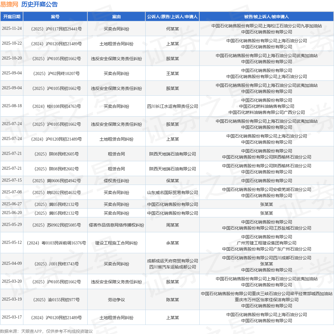 案号:(2025)沪0117民初29441号根据统计,近一年内以中国石化销售股份有限公司为当事人的历史开庭公告有29则,其中案由为“买卖合同纠纷”的公告以11则居首,其次为“违反安全保障义务责任纠纷”有4则,“土地租赁合同纠纷”有3则。历史开庭公告(前20条)如下: