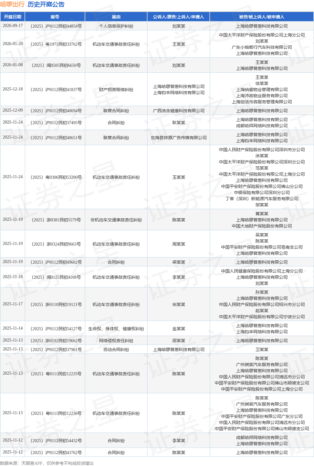 案号:(2025)粤0306民初53200号根据统计,近一年内以上海哈啰普惠科技有限公司为当事人的历史开庭公告有275则,其中案由为“机动车交通事故责任纠纷”的公告以79则居首,其次为“合同纠纷”有48则,“联营合同纠纷”有25则。历史开庭公告(前20条)如下: