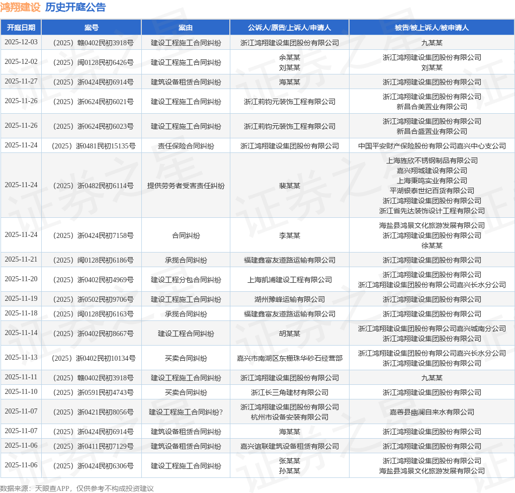 案号:(2025)浙0481民初15135号根据统计,近一年内以浙江鸿翔建设集团股份有限公司为当事人的历史开庭公告有216则,其中案由为“建设工程施工合同纠纷”的公告以46则居首,其次为“买卖合同纠纷”有32则,“建设工程分包合同纠纷”有27则。历史开庭公告(前20条)如下: