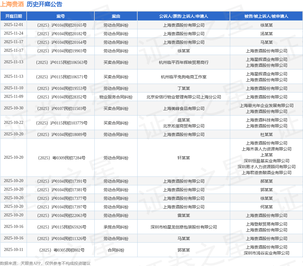 案号:(2025)沪0104民初20182号根据统计,近一年内以上海贵酒股份有限公司为当事人的历史开庭公告有94则,其中案由为“劳动合同纠纷”的公告以36则居首,其次为“合同纠纷”有14则,“买卖合同纠纷”有9则。历史开庭公告(前20条)如下: