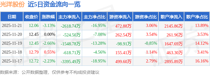 证券之星消息,截至2025年11月21日收盘,光洋股份(002708)报收于12.06元,下跌3.13%,换手率2.47%,成交量12.72万手,成交额1.54亿元。