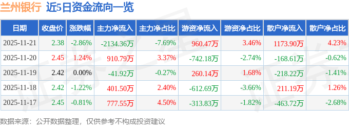 证券之星消息,截至2025年11月21日收盘,兰州银行(001227)报收于2.38元,下跌2.86%,换手率2.73%,成交量115.03万手,成交额2.77亿元。