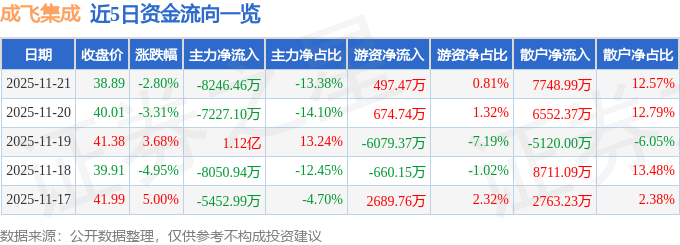 证券之星消息,截至2025年11月21日收盘,成飞集成(002190)报收于38.89元,下跌2.8%,换手率4.36%,成交量15.62万手,成交额6.16亿元。