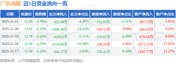 证券之星消息,截至2025年11月21日收盘,广东鸿图(002101)报收于12.26元,下跌2.78%,换手率1.23%,成交量8.18万手,成交额1.01亿元。