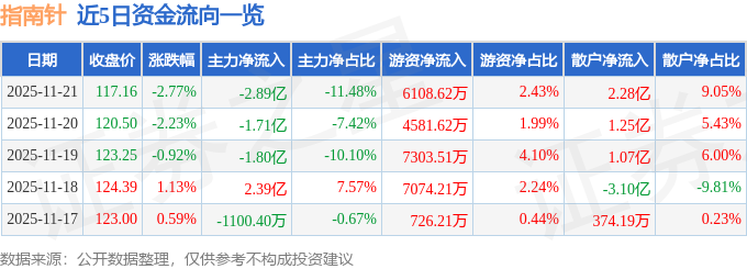 证券之星消息,截至2025年11月21日收盘,指南针(300803)报收于117.16元,下跌2.77%,换手率3.53%,成交量21.13万手,成交额25.15亿元。