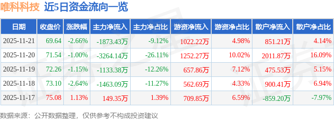 证券之星消息,截至2025年11月21日收盘,唯科科技(301196)报收于69.64元,下跌2.66%,换手率2.35%,成交量2.93万手,成交额2.05亿元。