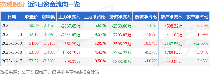 证券之星消息,截至2025年11月21日收盘,杰瑞股份(002353)报收于50.89元,下跌2.45%,换手率1.01%,成交量7.01万手,成交额3.61亿元。