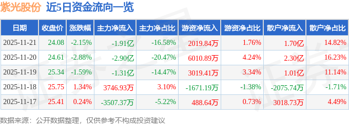 证券之星消息,截至2025年11月21日收盘,紫光股份(000938)报收于24.08元,下跌2.15%,换手率1.66%,成交量47.35万手,成交额11.5亿元。