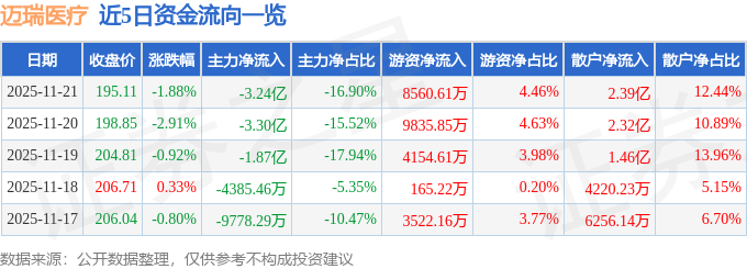 证券之星消息,截至2025年11月21日收盘,迈瑞医疗(300760)报收于195.11元,下跌1.88%,换手率0.81%,成交量9.79万手,成交额19.18亿元。