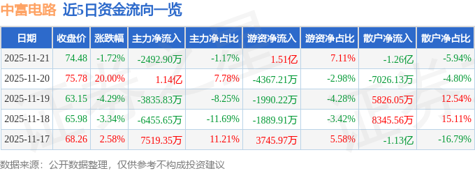证券之星消息,截至2025年11月21日收盘,中富电路(300814)报收于74.48元,下跌1.72%,换手率14.68%,成交量28.1万手,成交额21.3亿元。