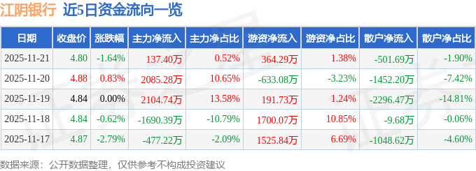 证券之星消息,截至2025年11月21日收盘,江阴银行(002807)报收于4.8元,下跌1.64%,换手率2.22%,成交量54.5万手,成交额2.64亿元。