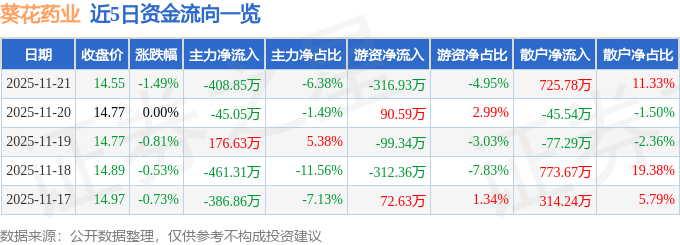 证券之星消息,截至2025年11月21日收盘,葵花药业(002737)报收于14.55元,下跌1.49%,换手率0.75%,成交量4.4万手,成交额6407.01万元。