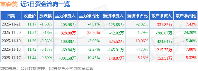 证券之星消息,截至2025年11月21日收盘,富森美(002818)报收于11.17元,下跌1.5%,换手率1.33%,成交量3.98万手,成交额4467.4万元。