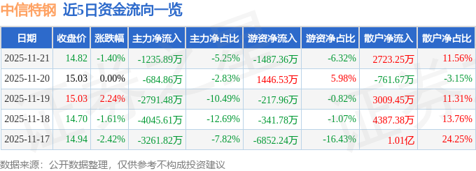 证券之星消息,截至2025年11月21日收盘,中信特钢(000708)报收于14.82元,下跌1.4%,换手率0.31%,成交量15.75万手,成交额2.35亿元。