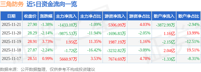 证券之星消息,截至2025年11月21日收盘,三角防务(300775)报收于27.9元,下跌1.38%,换手率8.81%,成交量46.84万手,成交额13.16亿元。